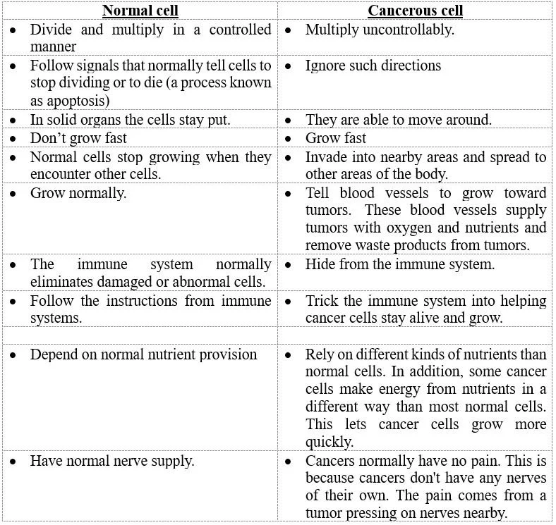 Cancer cells differ from normal cells in many ways. Normally, cells follow instructions provided by genes. Genes set down rules for cells to follow, such as when to start and stop growing. Cancerous cells ignore the rules that normal cells follow:[2]