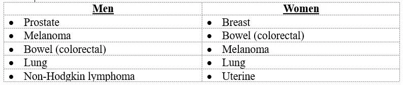 There are more than 100 different types of cancer, but following five most diagnosed cancers in 2023 accounted for 60% of all total diagnosed including: prostate, followed by breast, melanoma, colorectal or bowel cancer, and lung cancer.