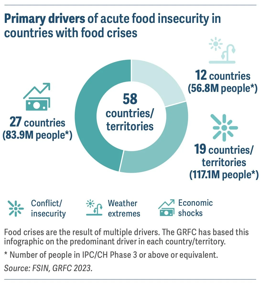 Food security is essential to people’s health and well-being. The World Health Organization (WHO) argues that “health is wealth and poor health is an integral part of poverty; governments should actively seek to preserve their people’s lives and reduce the incidence of unnecessary mortality and avoidable illnesses”. However, lack of food is one of the factors which affect health outcomes. The social determinants of health, such as poverty and food insecurity, are associated with some of the most severe and costly health problems in a country. It is generally believed that food security and nutrition are crucial to improving human health and development. The global food crisis is affecting millions of people around the world. In 2023, record levels of acute food insecurity persisted due to protracted food crises and new shocks. In 58 countries, 257.8 million people were found facing high levels of acute food insecurity – 10% more than in 2022.[2]