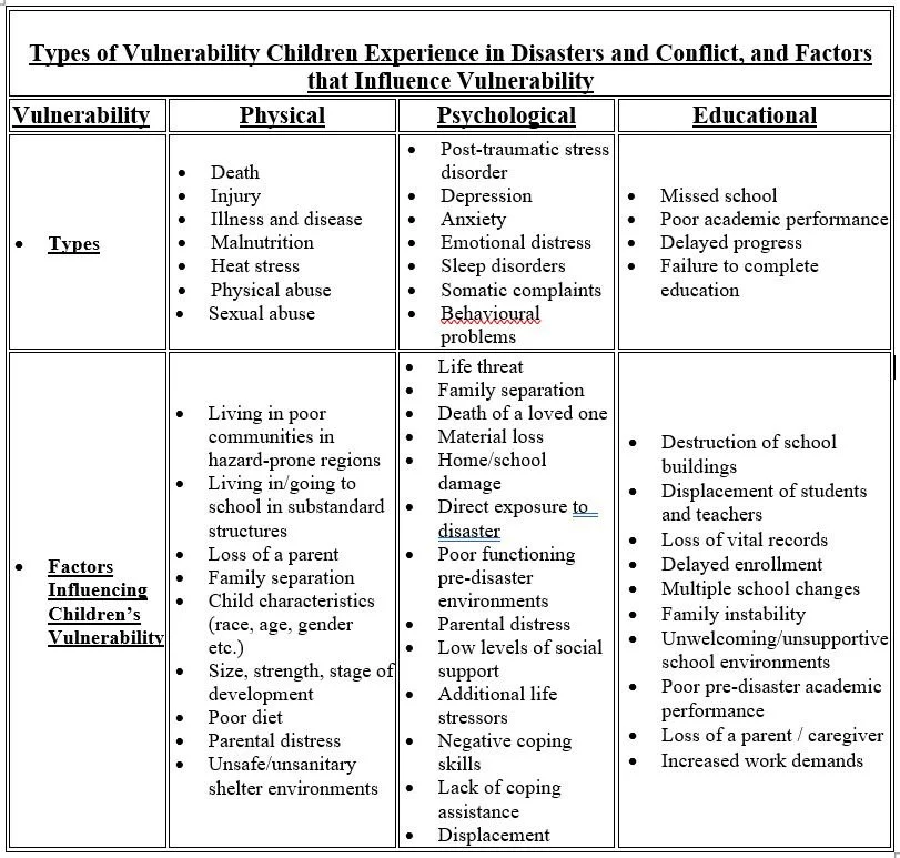 As the frequency and intensity of disaster events increase around the globe, children are among those most at risk for the negative effects of a disaster. They represent a significant portion of those who endure the devastating long-lasting consequences of disasters. Children are a highly vulnerable group, particularly infants and young children, who are partially or totally dependent on adults.